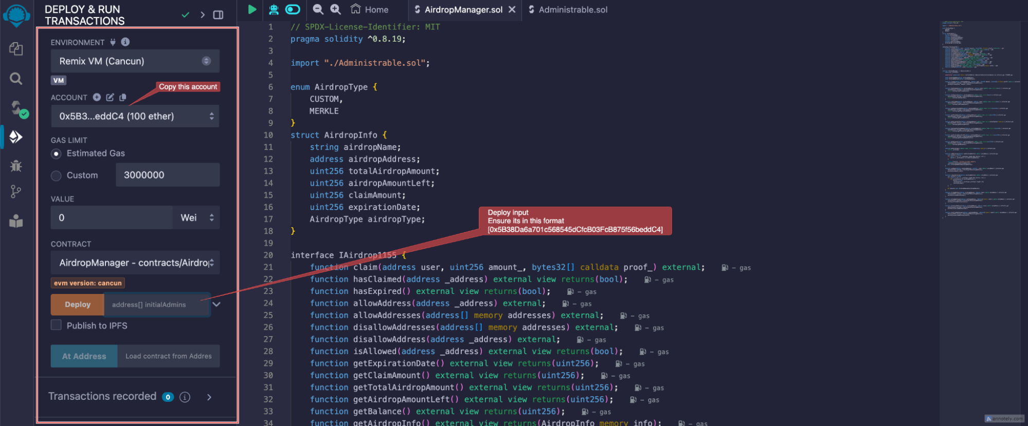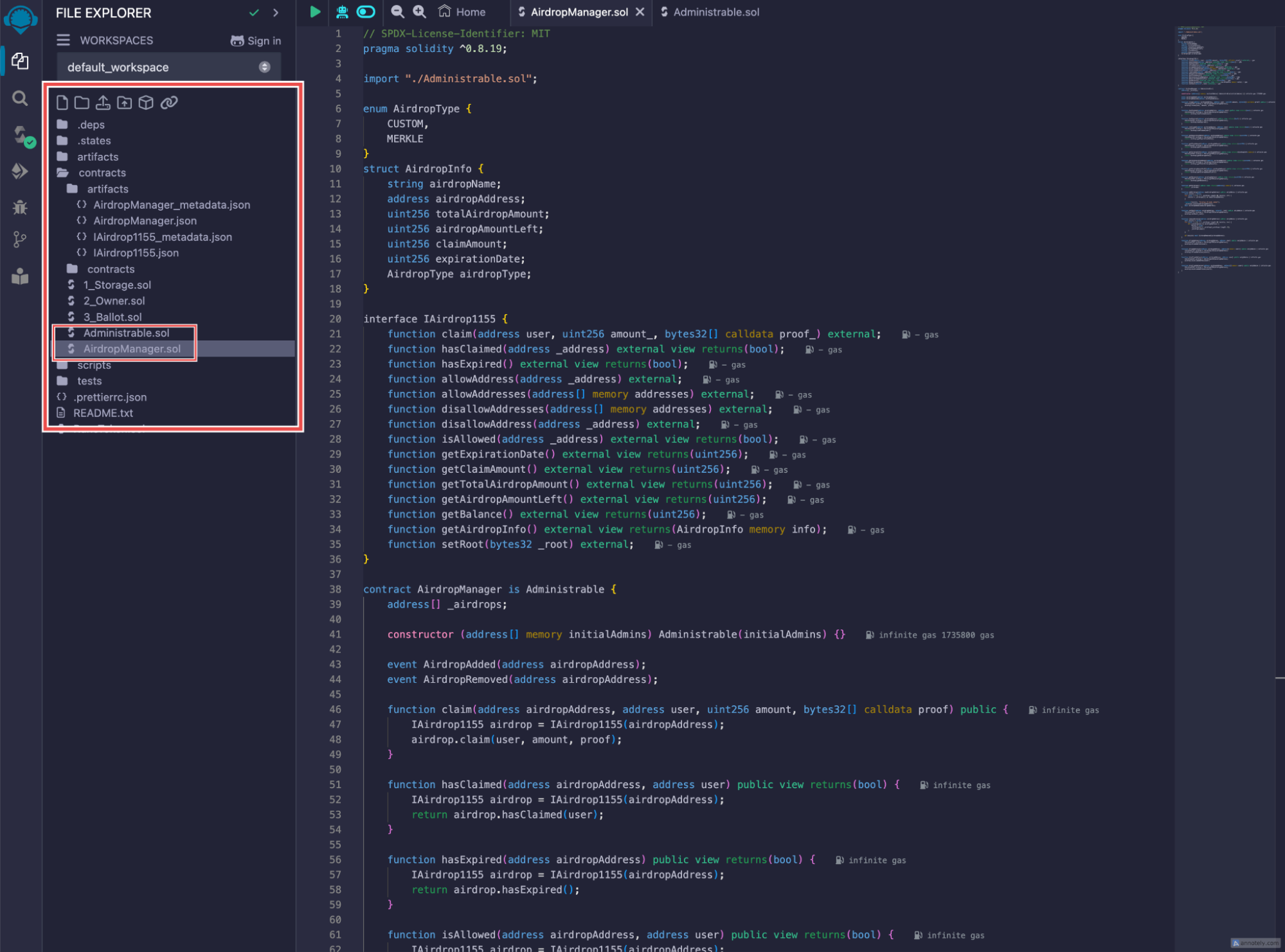 2. Copy the code from both AirdropManager.sol and Administrable.sol contracts. These files are crucial because the AirdropManager contract imports functions from Administrable.sol.