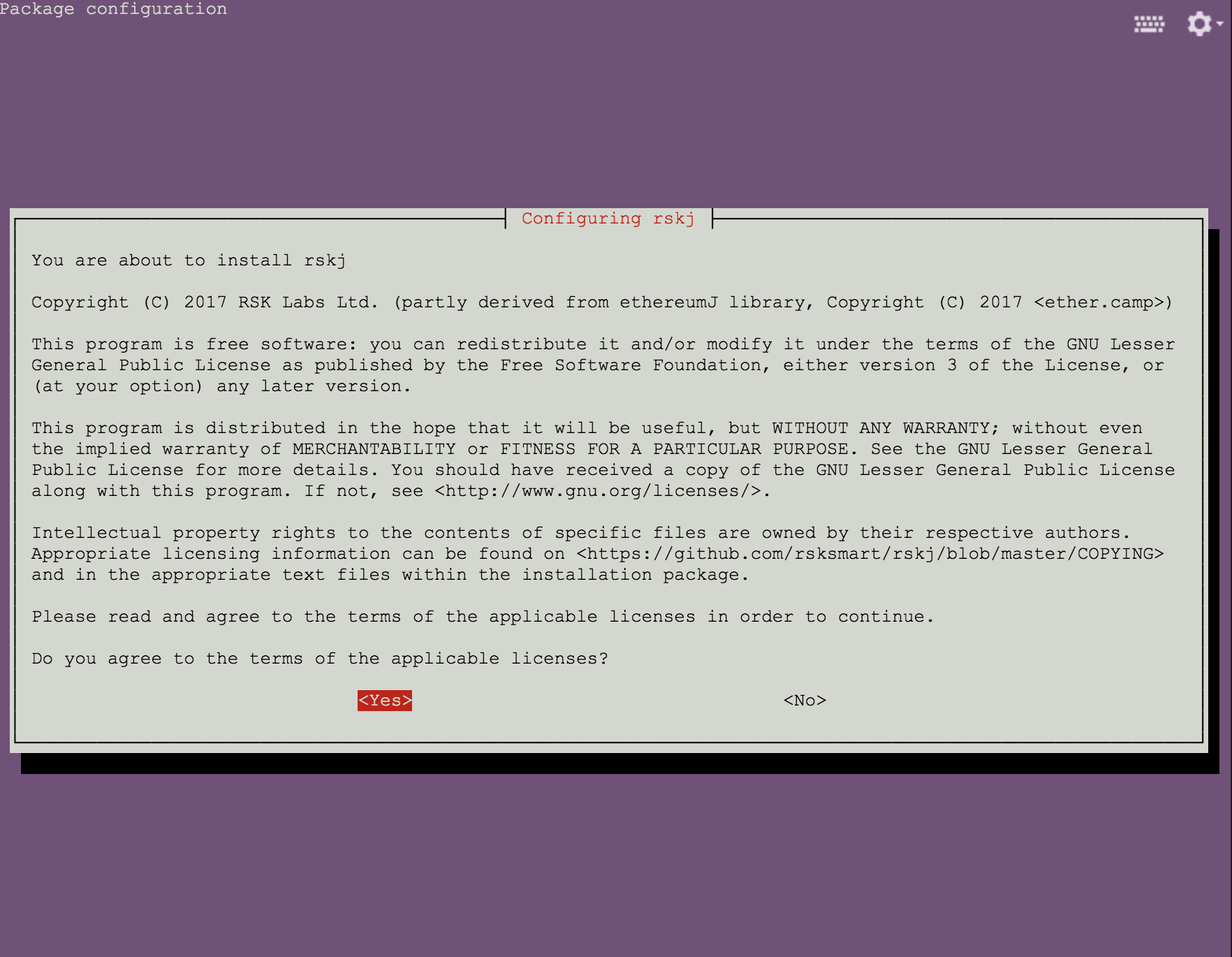 Choose Yes and Enter to accept the license to continue